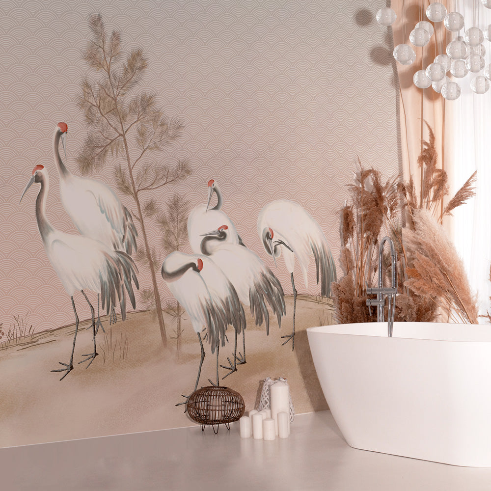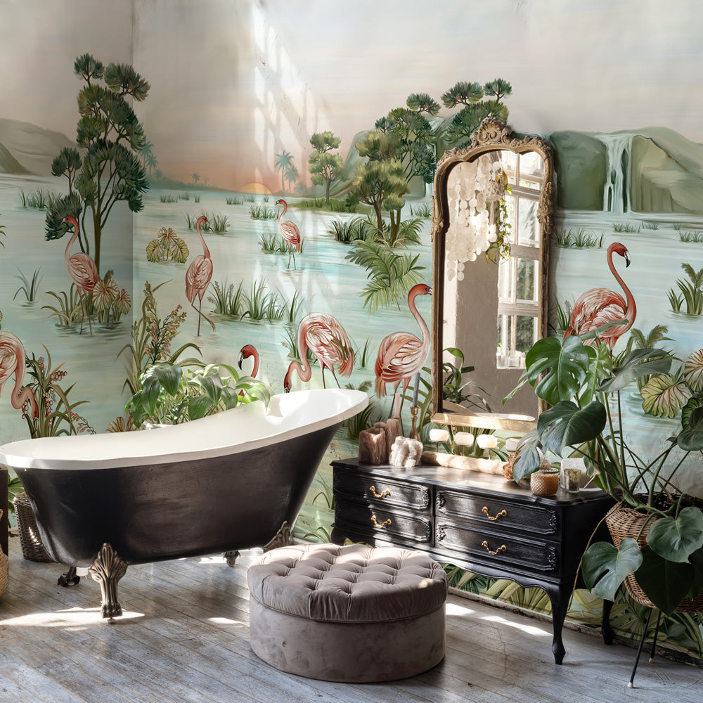 Carta da parati in Fibra di Vetro Lago dei fenicotteri Carta da parati in bagno - Ideale come rivestimento per piastrelle