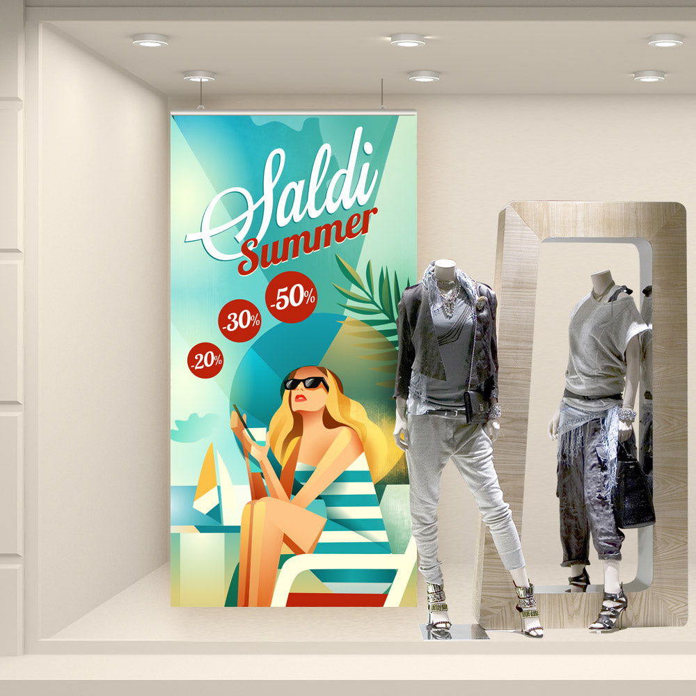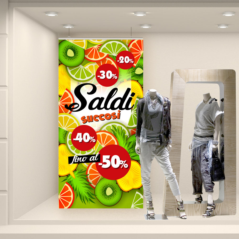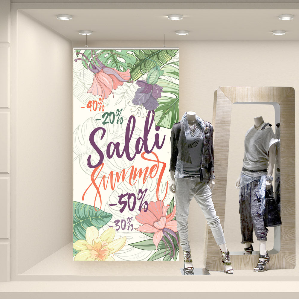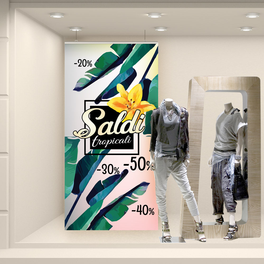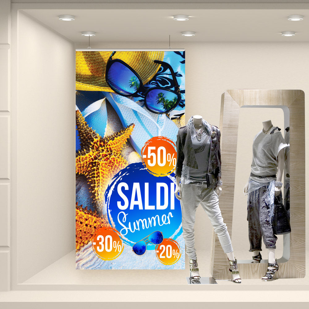 Fondale vetrina stampato ad alta risoluzione su tessuto fotografico. Corredato da bacchette in plastica rigida e ganci per la sospensione, è già pronto per l’utilizzo finale.