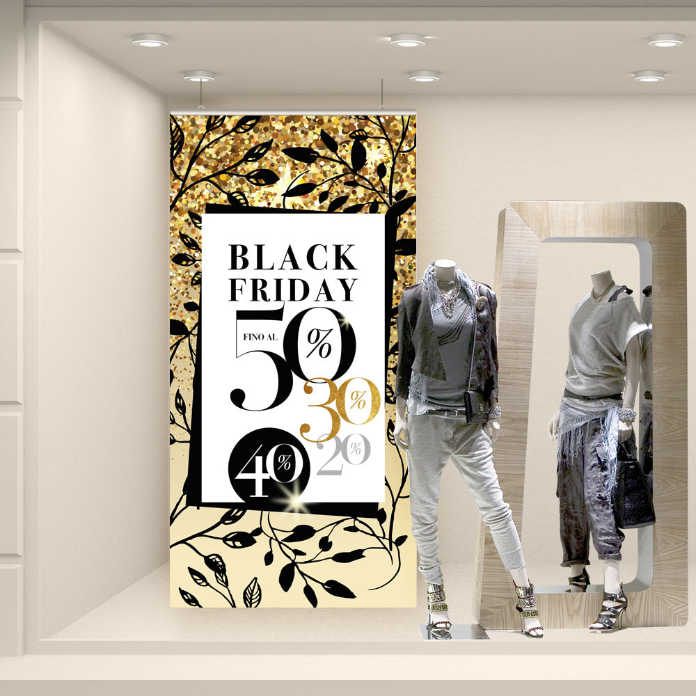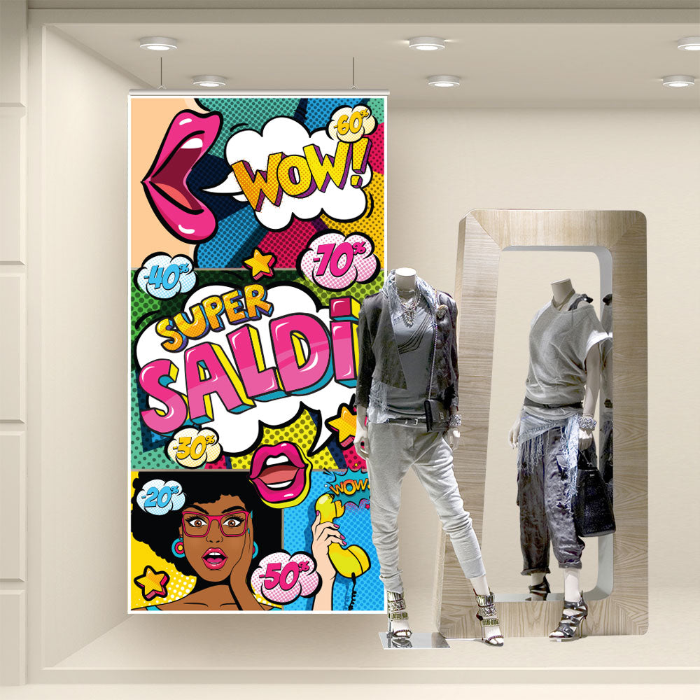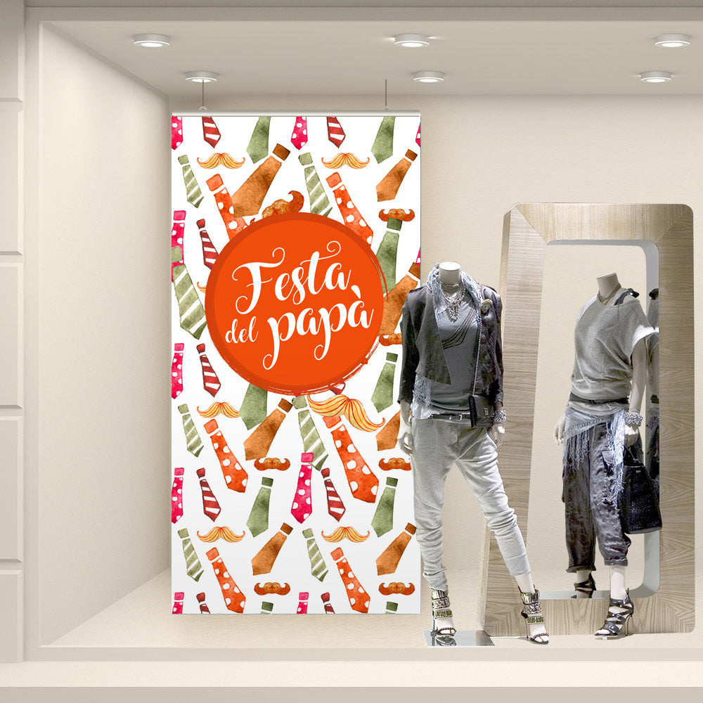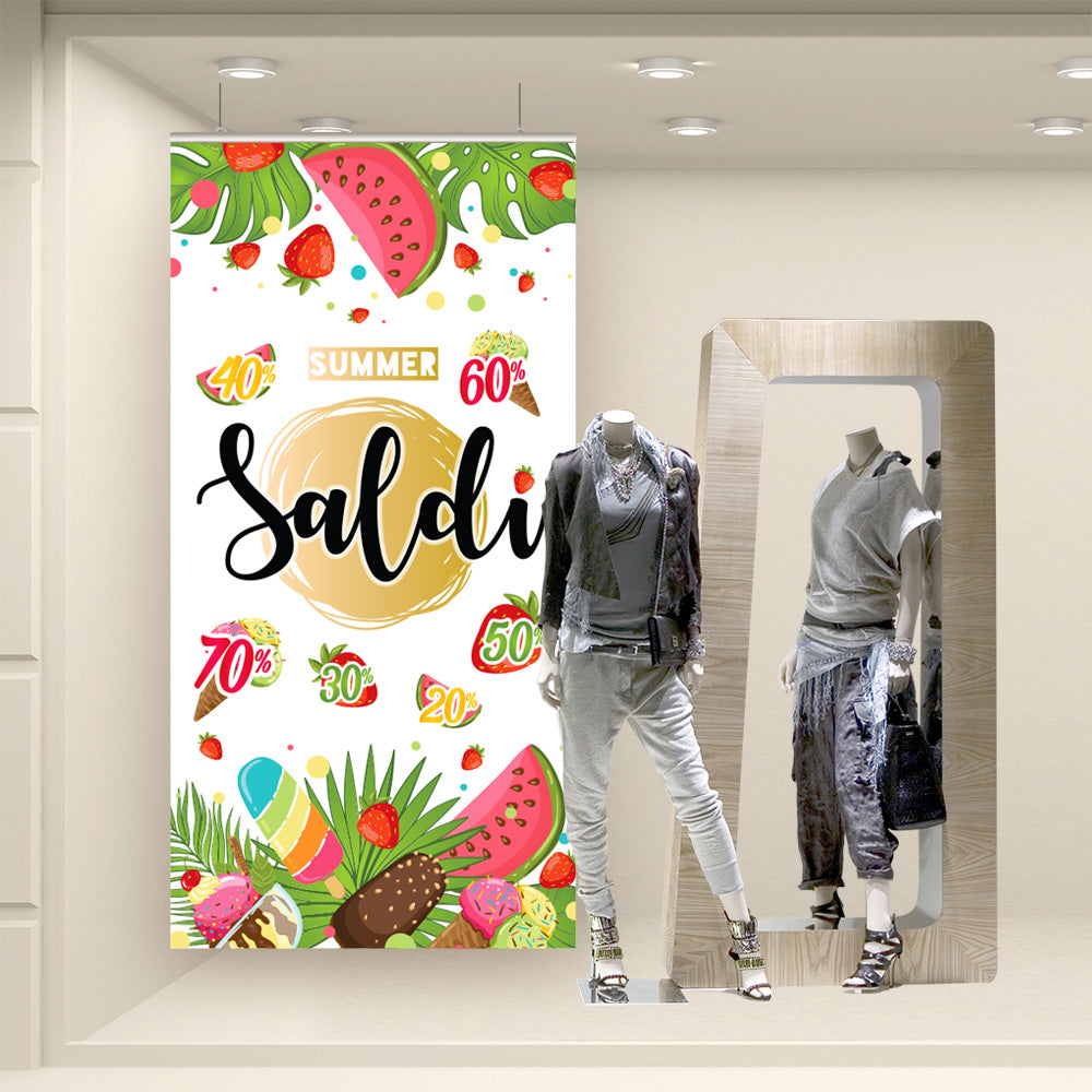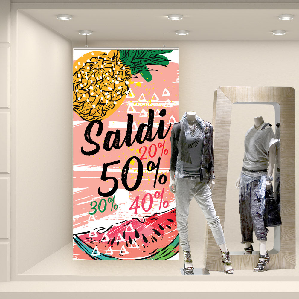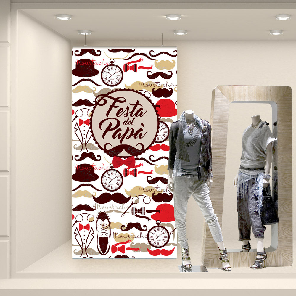 Fondale vetrina stampato ad alta risoluzione su tessuto fotografico. Corredato da bacchette in plastica rigida e ganci per la sospensione, è già pronto per l’utilizzo finale.