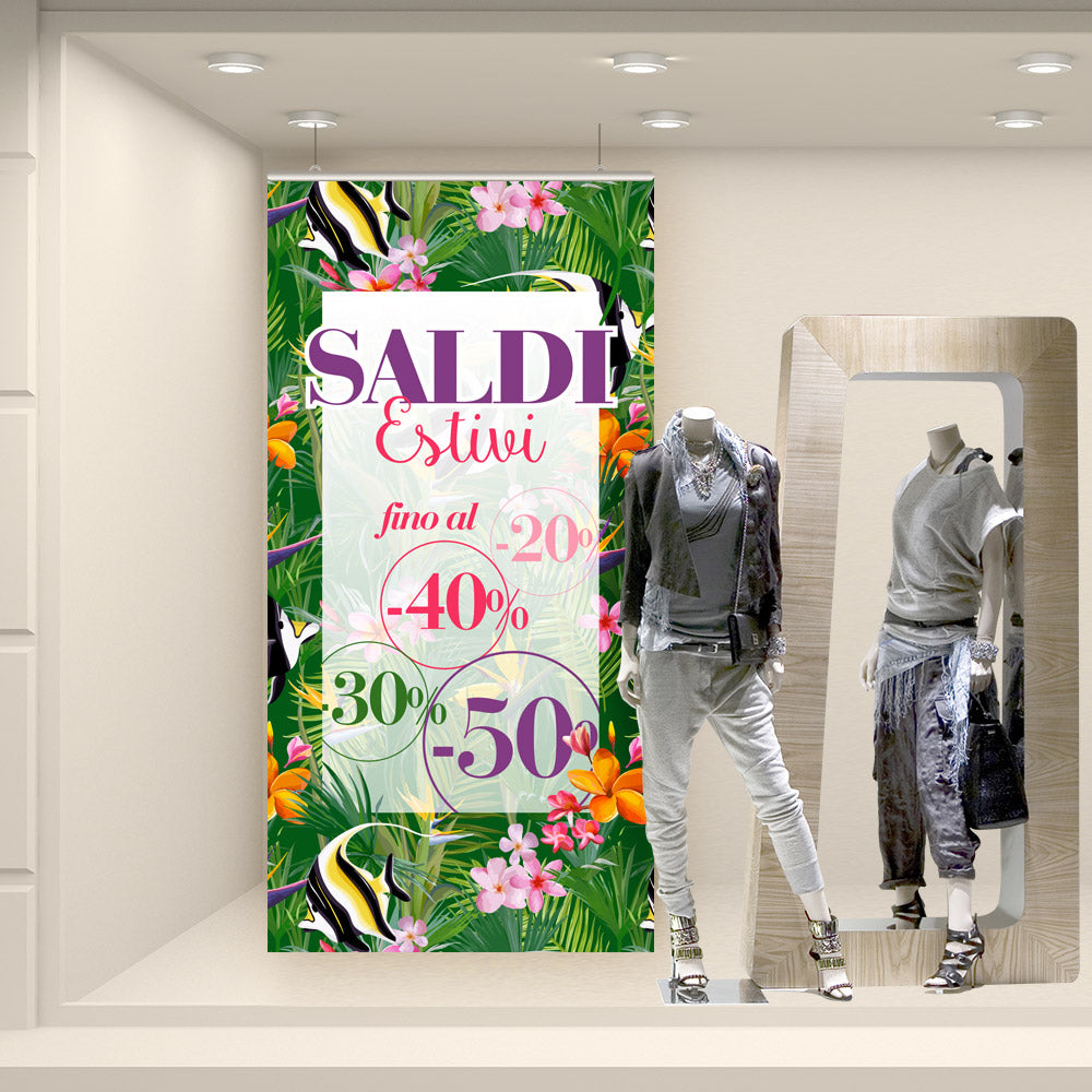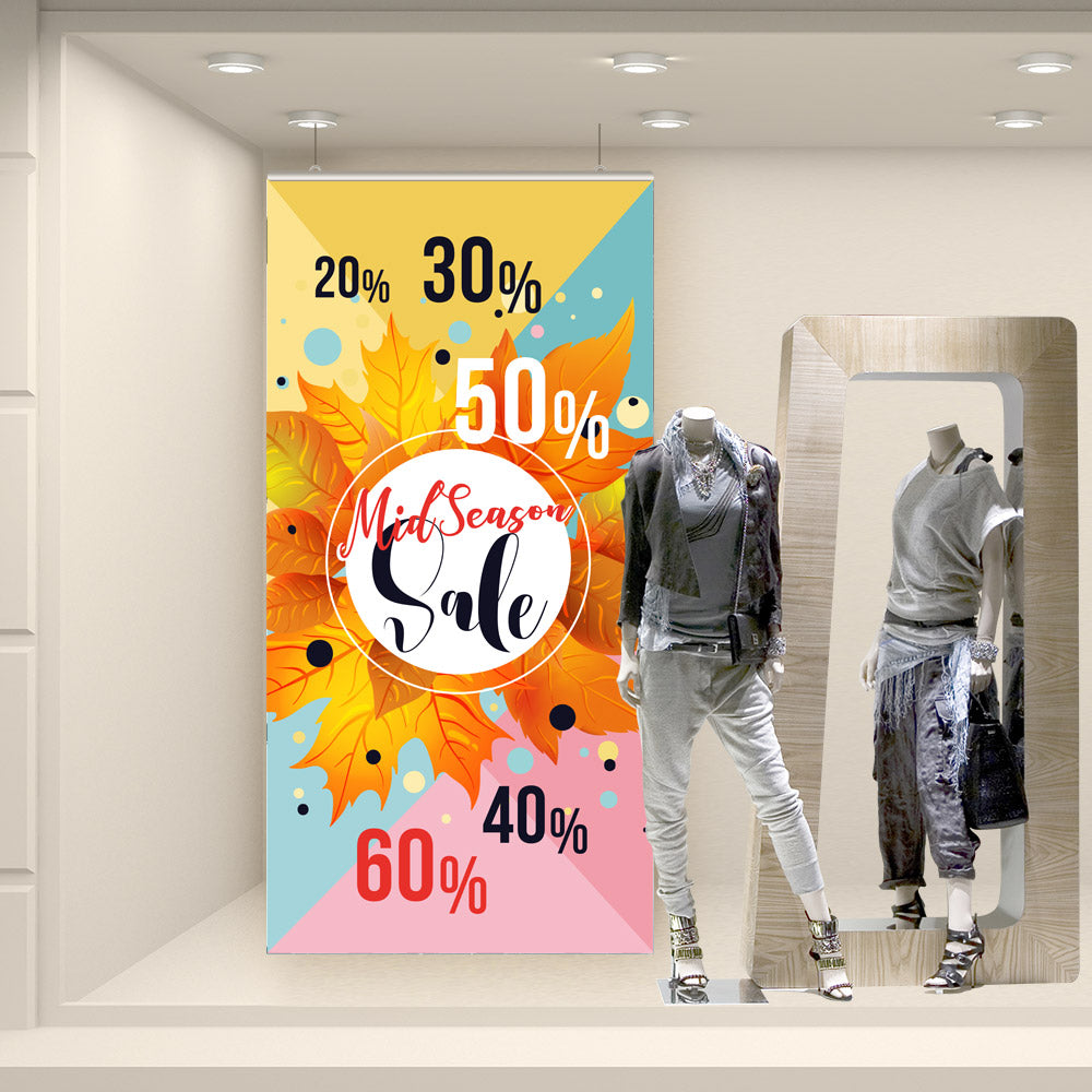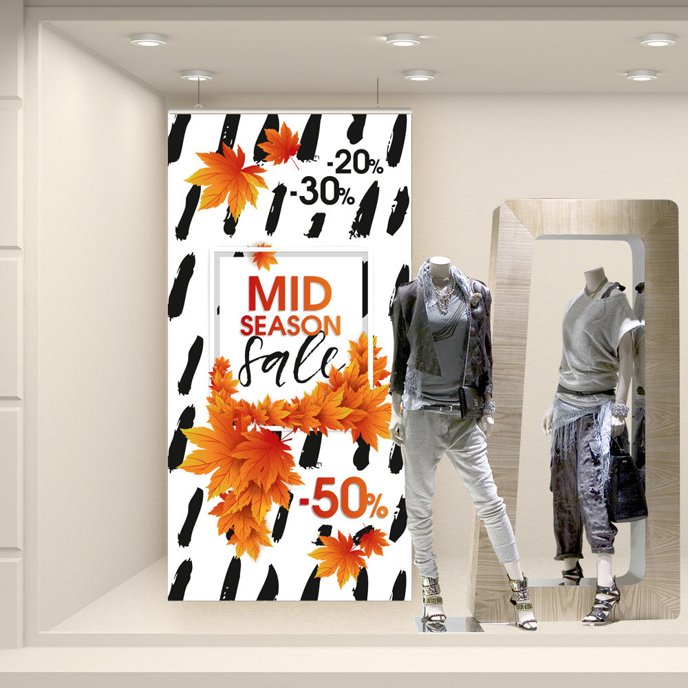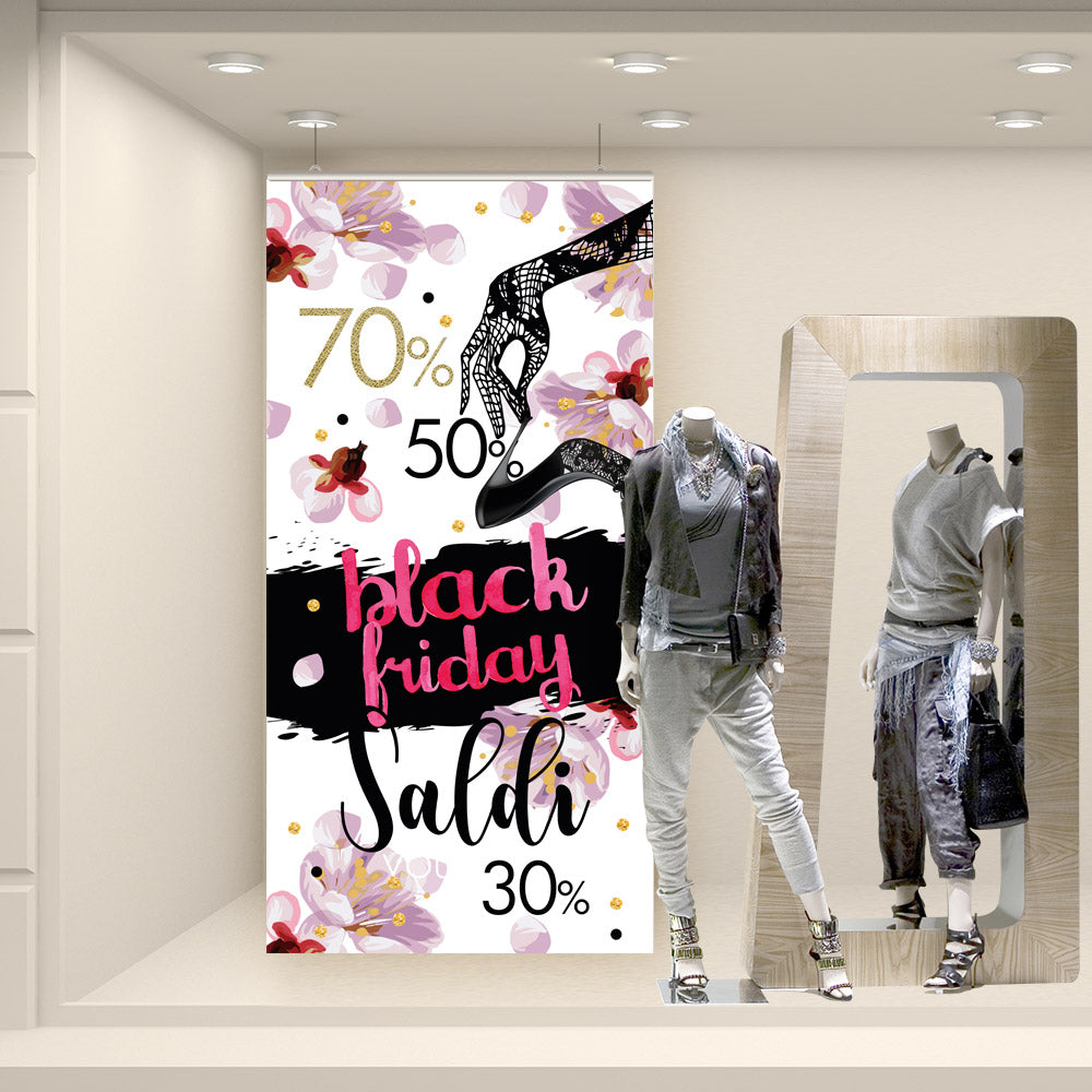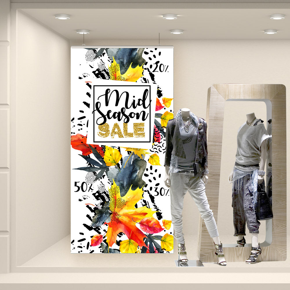 Fondale vetrina stampato ad alta risoluzione su tessuto fotografico. Corredato da bacchette in plastica rigida e ganci per la sospensione, è già pronto per l’utilizzo finale.