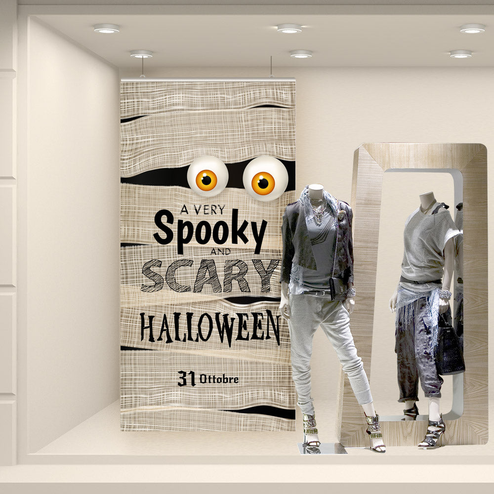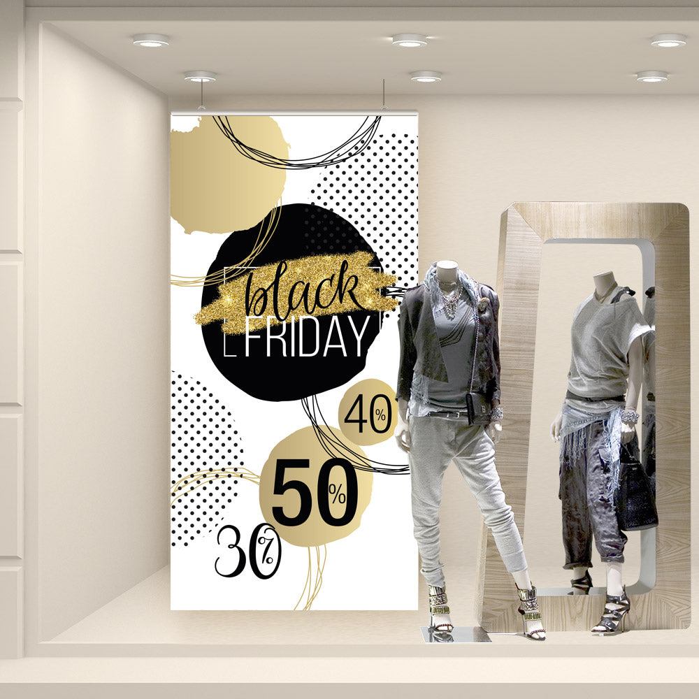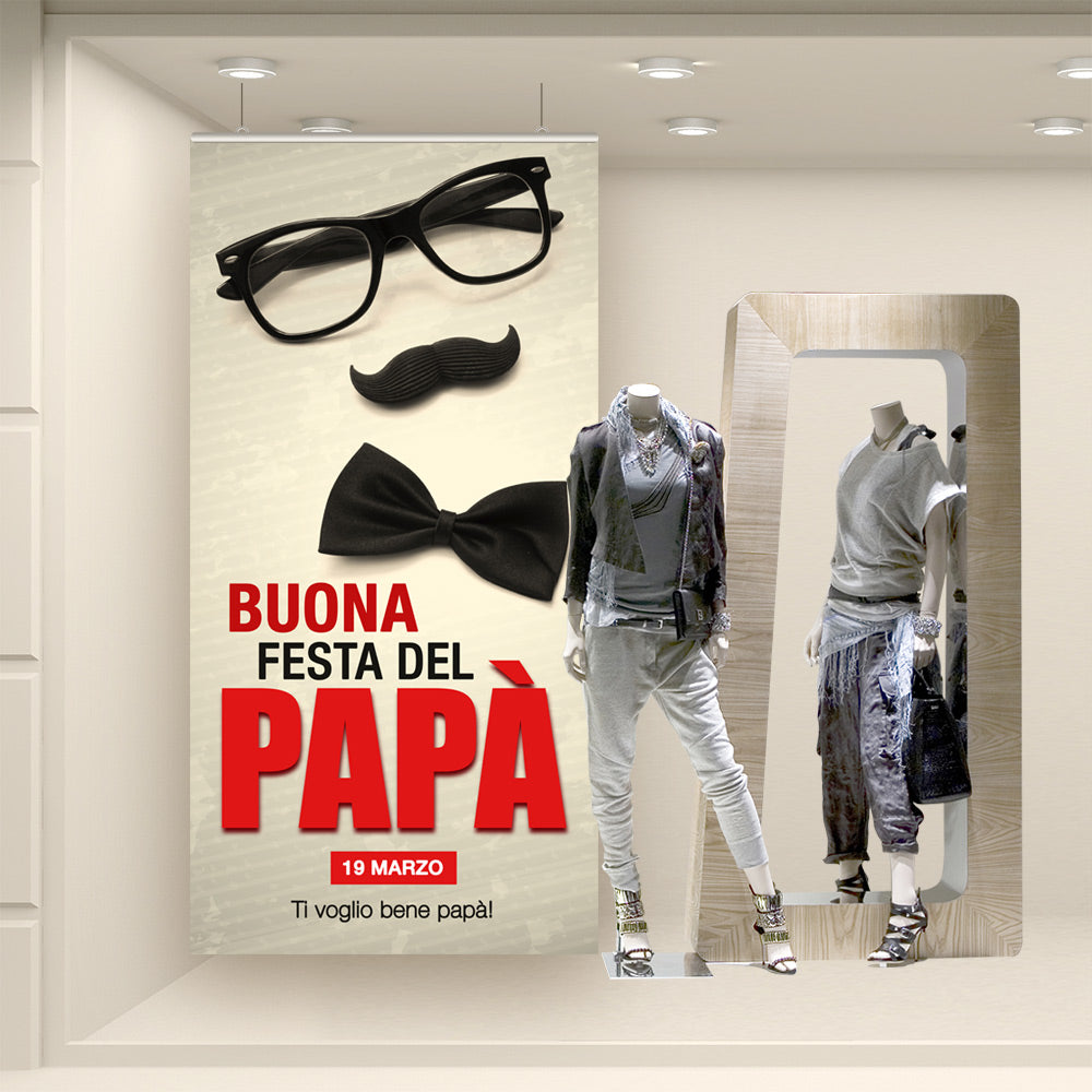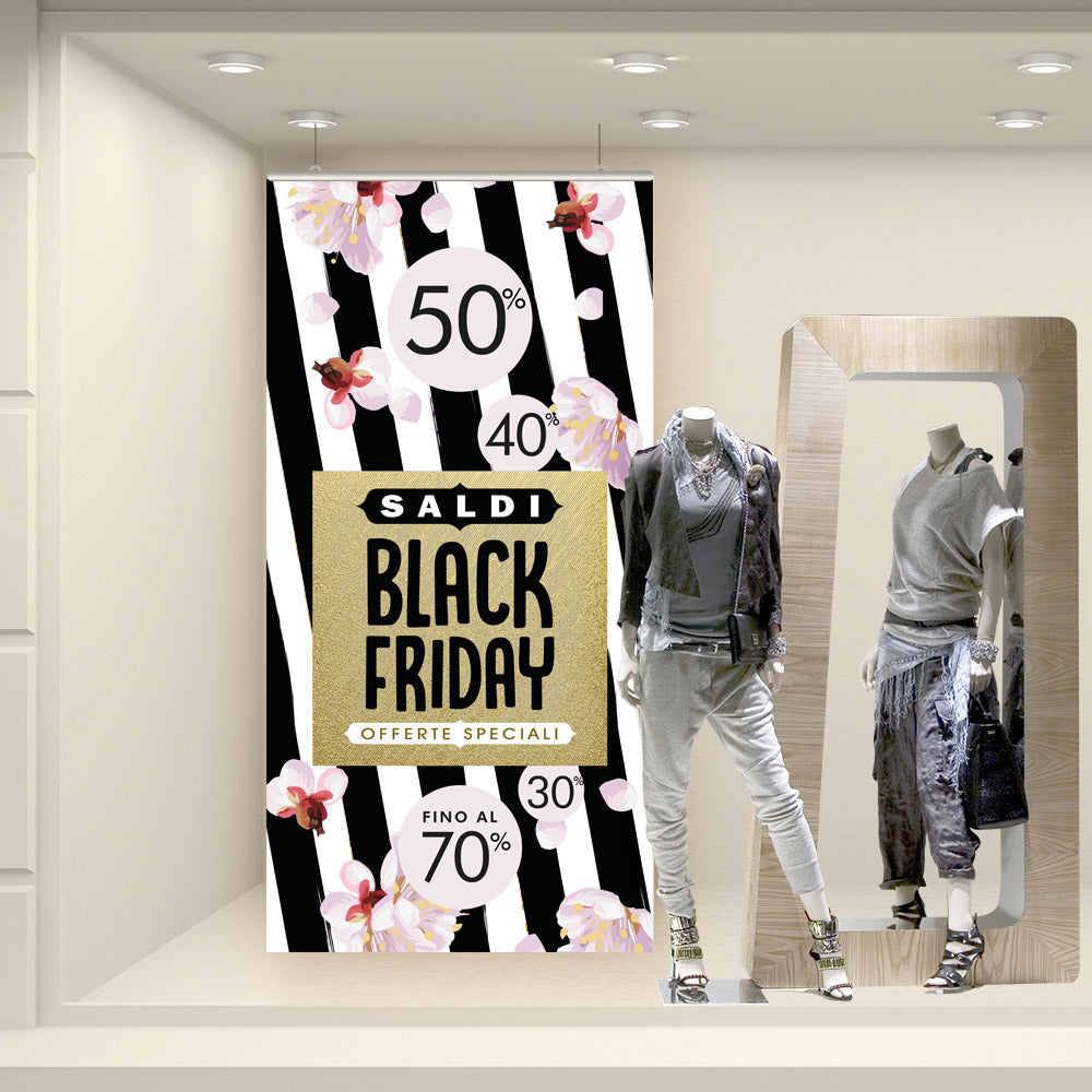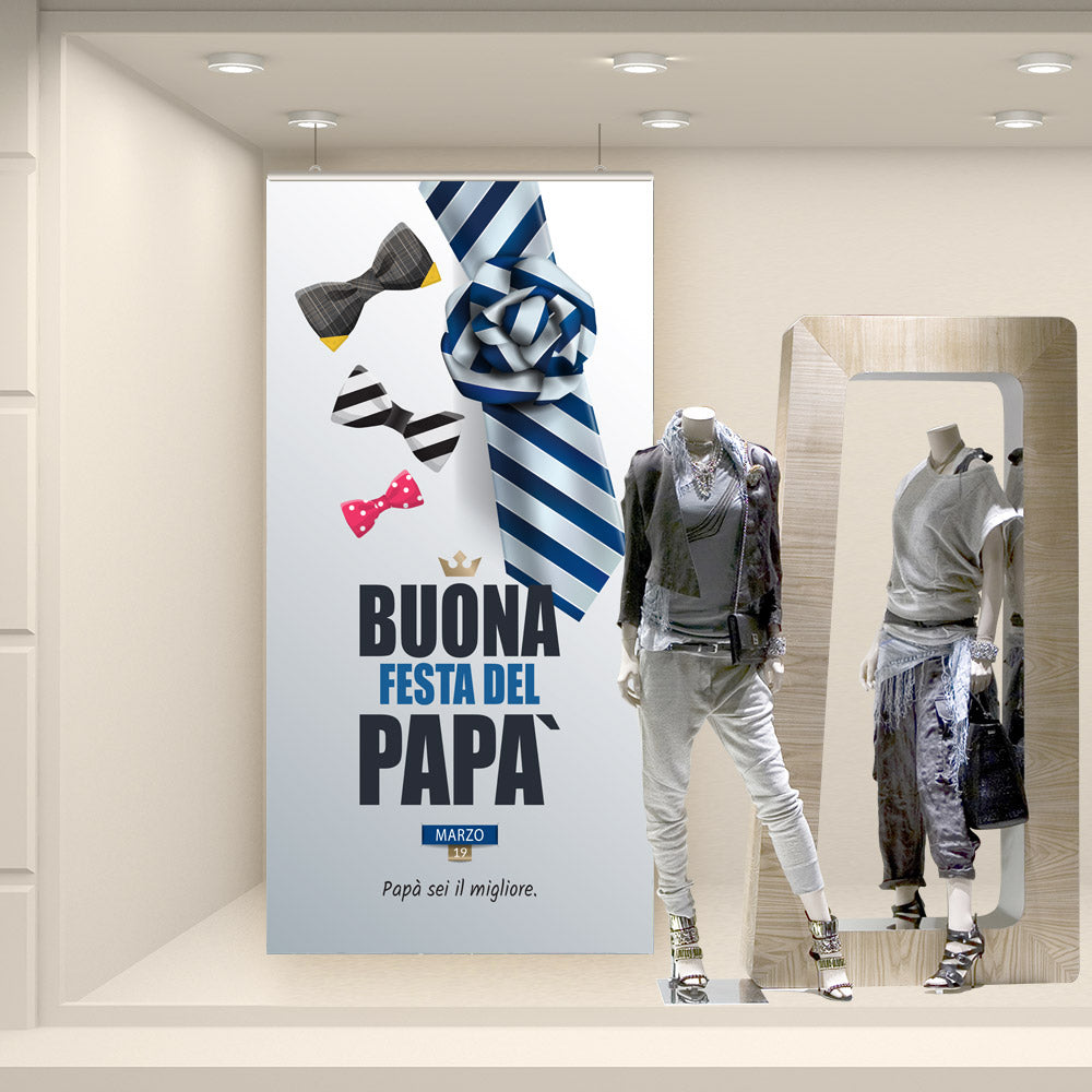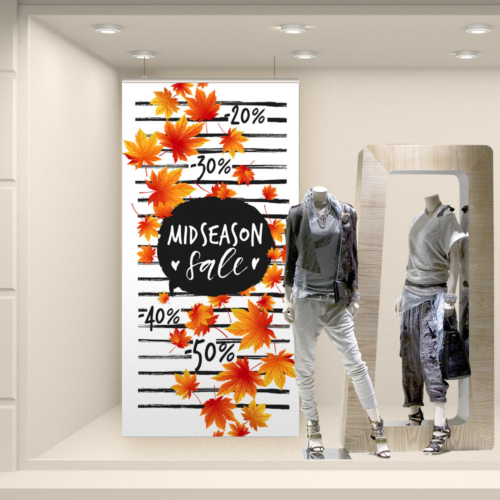 Fondale vetrina stampato ad alta risoluzione su tessuto fotografico. Corredato da bacchette in plastica rigida e ganci per la sospensione, è già pronto per l’utilizzo finale.