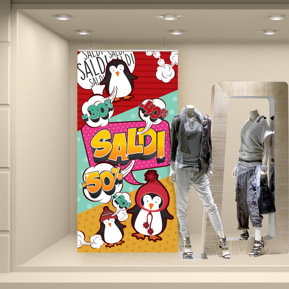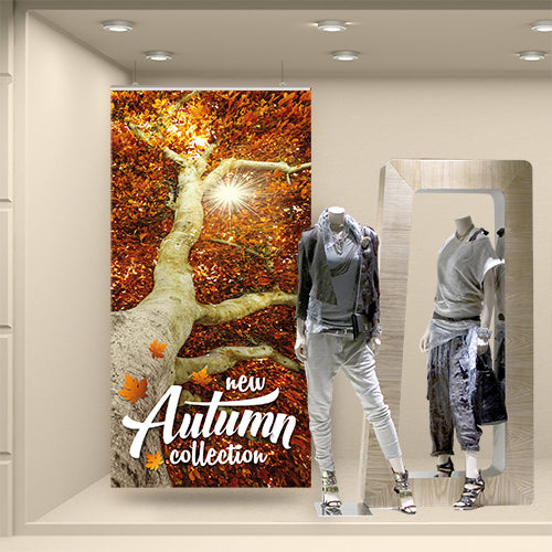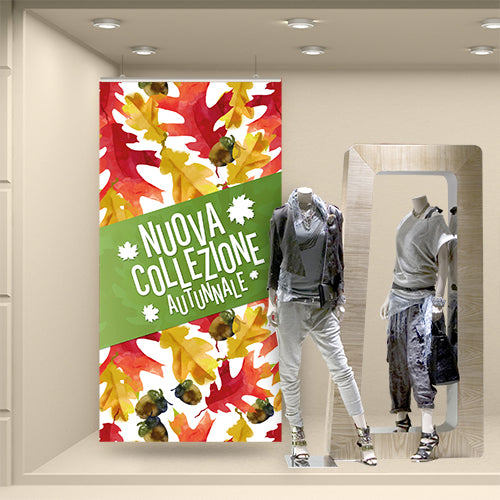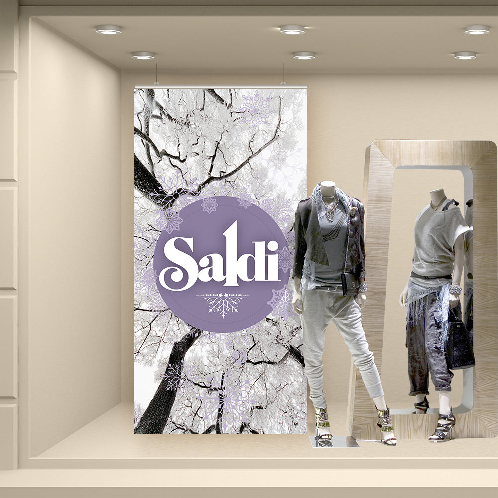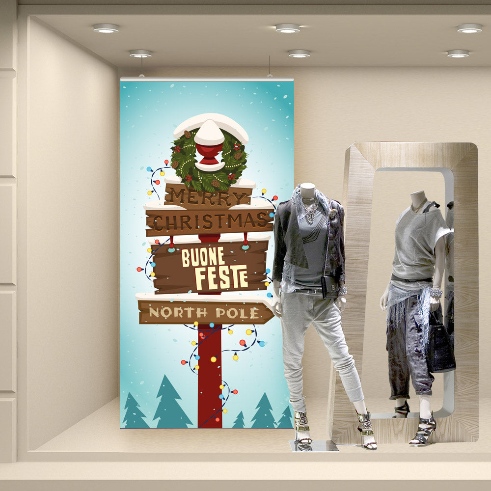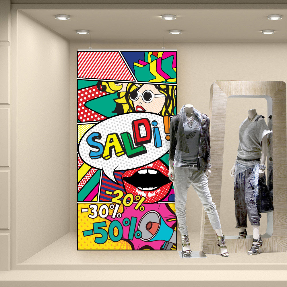 Fondale vetrina stampato ad alta risoluzione su tessuto fotografico. Corredato da bacchette in plastica rigida e ganci per la sospensione, è già pronto per l’utilizzo finale.