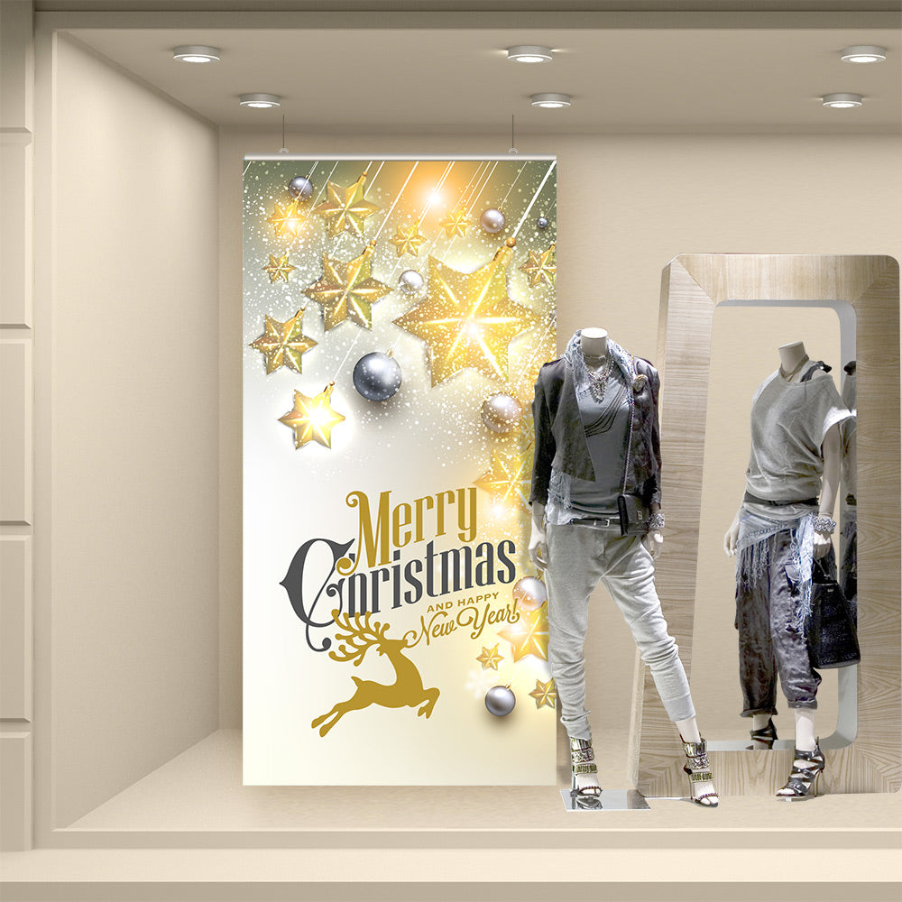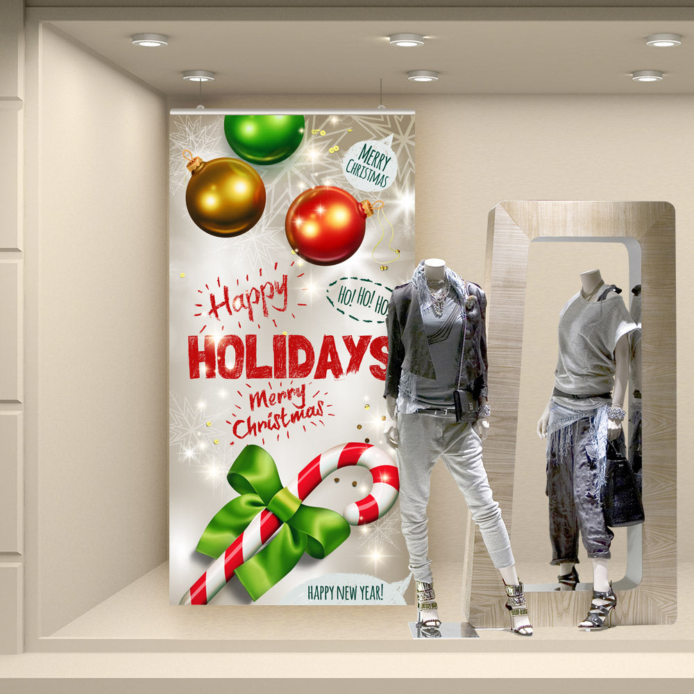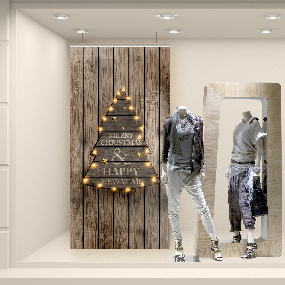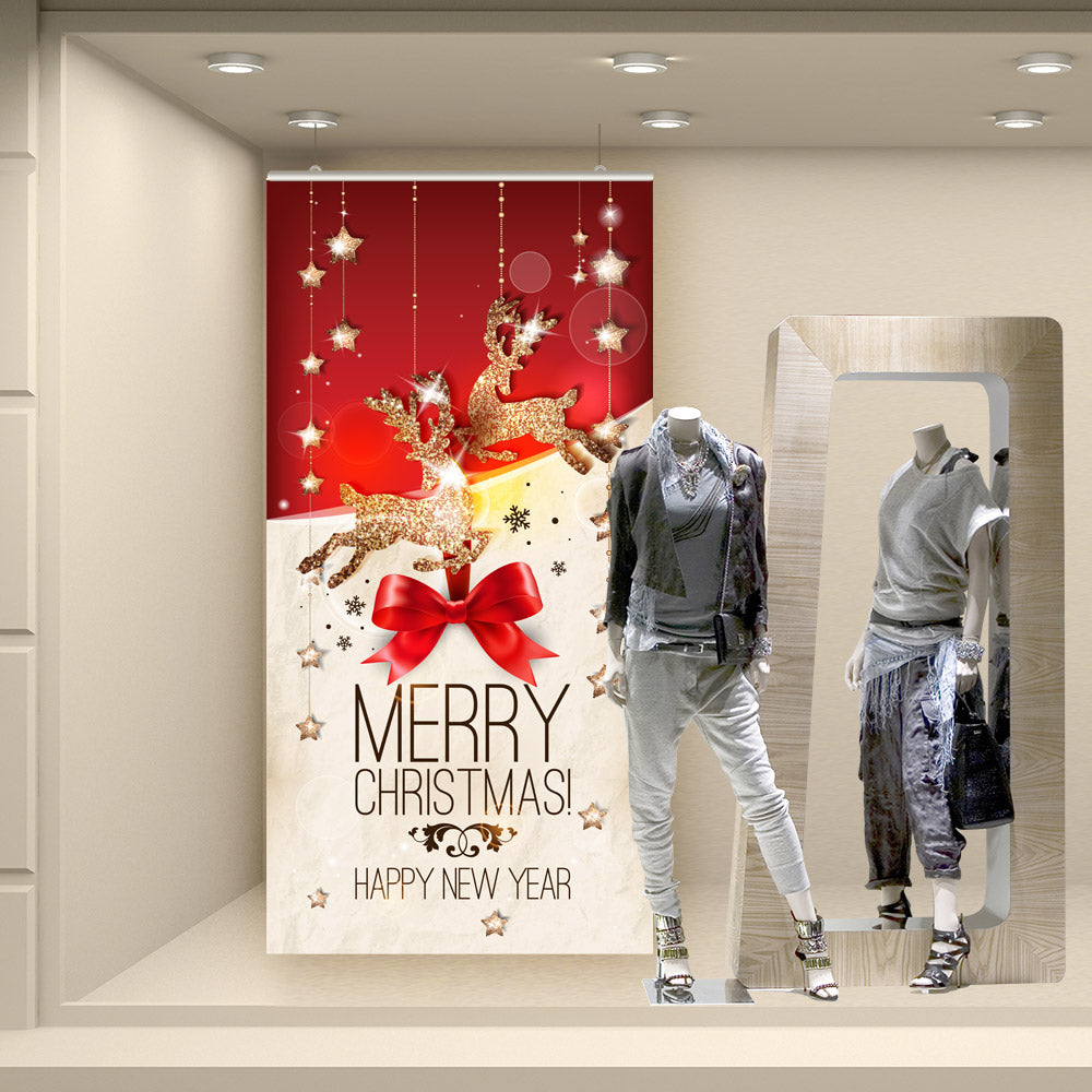 Fondale vetrina stampato ad alta risoluzione su tessuto fotografico. Corredato da bacchette in plastica rigida e ganci per la sospensione, è già pronto per l’utilizzo finale.