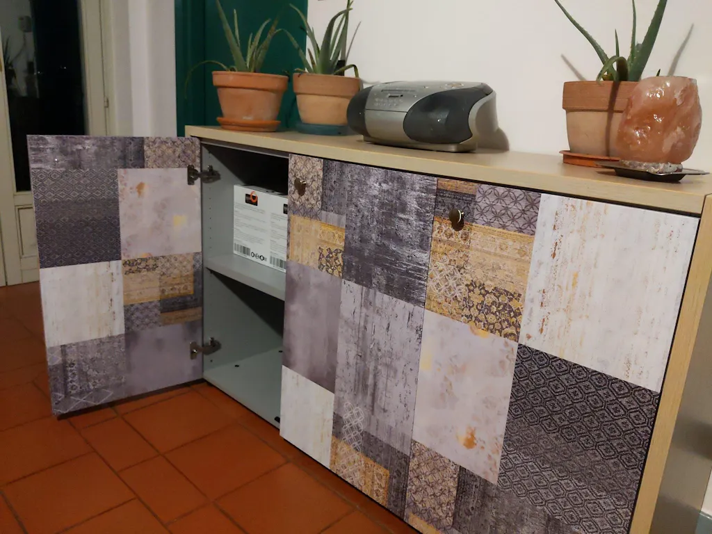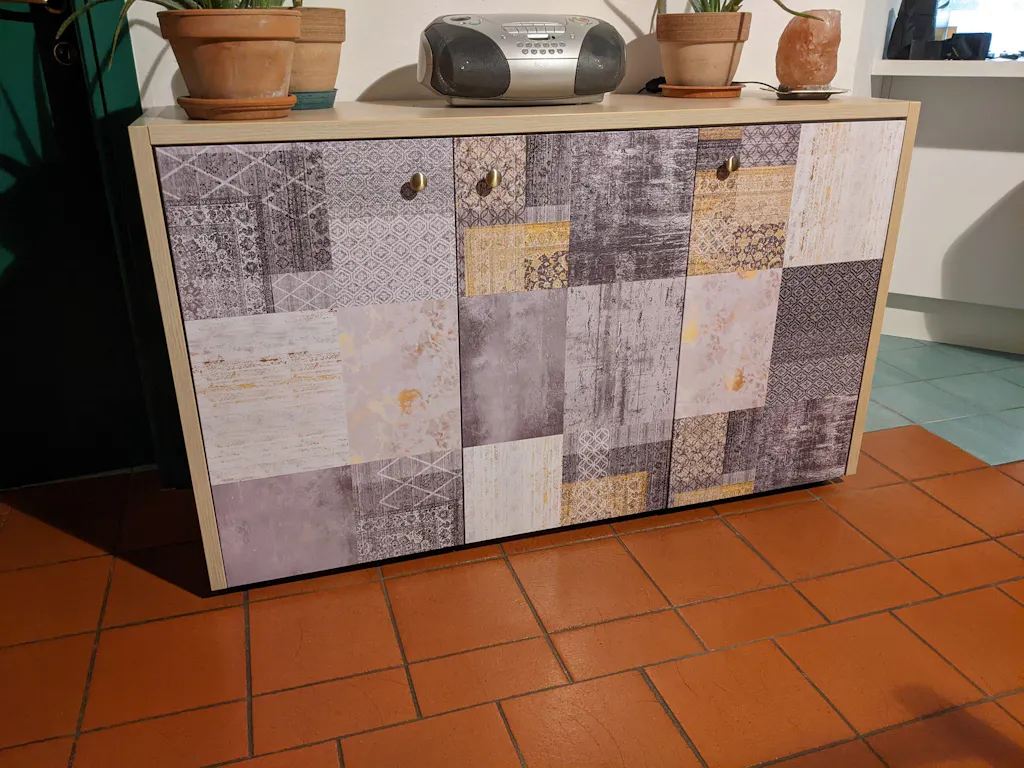 Carta adesiva di ottima qualità, abbiamo rivestito le ante di un mobile in laminato. Seguite bene le istruzioni, e cercate un tutorial su come fare gli angoli se necessario! La difficoltà è stata soprattutto incollare la fantasia dritta, e fare combaciare un'anta con l'altra, ma con calma si fa (il phon è il vostro migliore alleato).